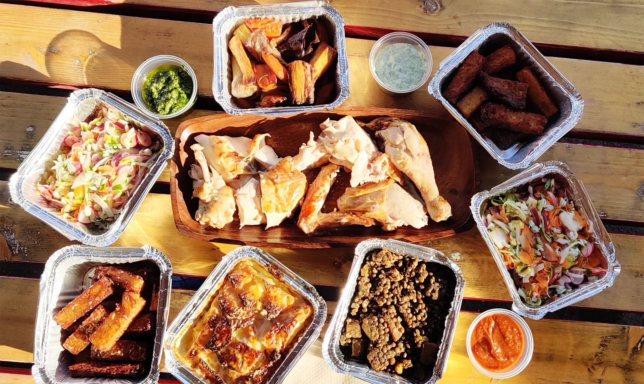 Pick from a range of homemade sauces and proper sides – the kind that turn a rotisserie chicken into a full meal whether you’re eating at the table or laying it all out at home.